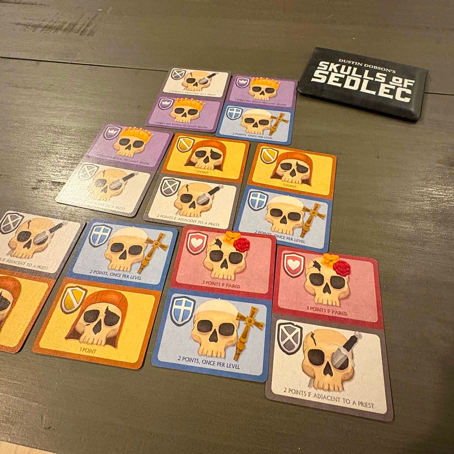 It’s hard not to be impressed by how much gameplay Button Shy squeezes into an 18-card package. The game centers on constructing a pyramid of cards, with each skull type introducing its own scoring challenge.