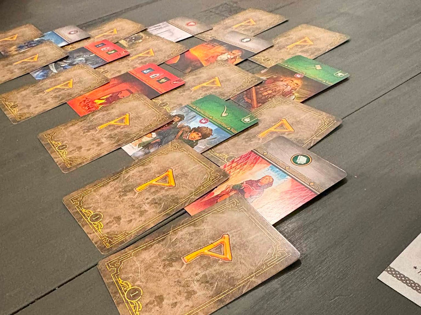 This is the gameplay equivalent of 7WD’s green scientific symbols, but a superior version. The goal is the same for victory — collect all six clan symbols and you win. Each clan has a stack of three tokens. If you ever have two matching clan symbols, you draw the top two tokens from that clan, keep one, and return the other.